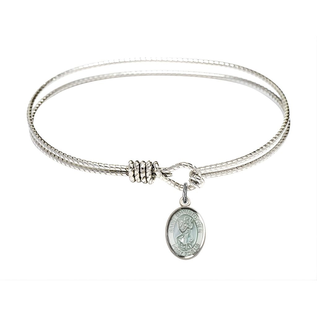 The Blue Epoxy St. Christopher Twist Design Bangle Bracelet by Bliss Manufacturing features a distinctive twist eye hook design with a sterling silver or gold-filled charm symbolizing the St. Christopher. Available in rhodium-plated or Hamilton gold finishes, this elegant bracelet suits adults, children, and teens alike. It comes in 6 1/4 and 7 1/4-inch sizes, with the charm measuring 1/2 by 1/4 inch. Personalized engraving with up to two lines of eight characters each is available for an additional, non-refundable fee. Handmade in the USA, it is presented in a deluxe gift box and backed by a lifetime guarantee. Inspired by St. Christopher, the revered patron saint of travelers and motorist, this piece serves as a steadfast reminder of your faith journey.
