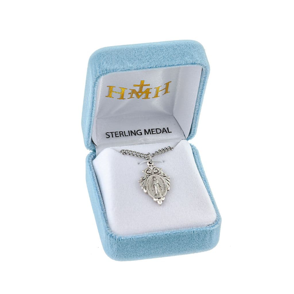 Wear this sterling silver fancy Leaf Swirled Top Border Miraculous Medal necklace as a daily reminder of faith and protection. Handcrafted by master New England silversmiths, the .925 solid silver medal features the Blessed Mother with radiating rays, rendered in exquisite detail on both sides. The stainless steel chain offers durability and comfort for everyday wear. This USA made by HMH Religious, devotional piece arrives in a luxurious velvet gift box and ideal for personal devotion or as a meaningful gift.