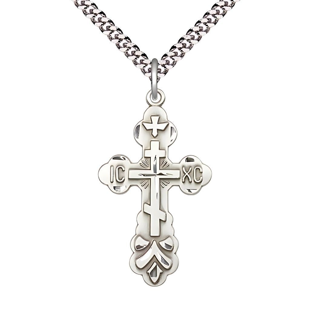 The St. Xenia Orthodox Cross features important Orthodox Christian symbols, including the three-bar cross associated with St. Andrew, representing the balance of righteousness, and the letters "IC XC," meaning "Jesus Christ." This cross honors St. Xenia of St. Petersburg, celebrated for her charitable acts and her role as a "fool for Christ." She is revered as the patron saint of St. Petersburg and is known for her powerful intercessions in matters such as employment, marriage, and protection for the homeless.