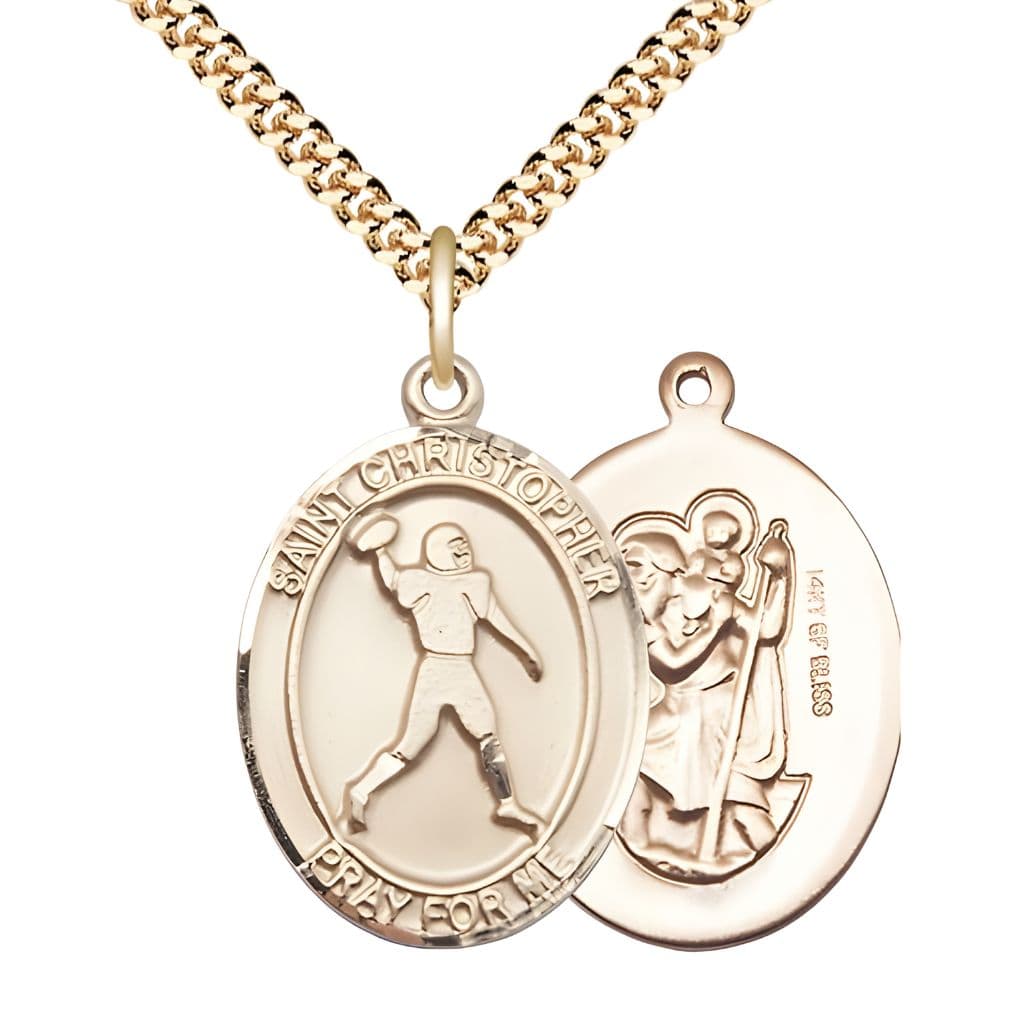 Discover the Football St. Christopher Gold-filled Oval Medal Necklace, a cherished Catholic devotional piece handcrafted in the USA by Bliss Manufacturing. The Football St. Christopher medal is beautifully honored in this elegant, high-quality medal, perfect for spiritual reflection or gifting. Each medal is presented in a deluxe gift box, making it an ideal choice for baptisms, confirmations, or special religious occasions.