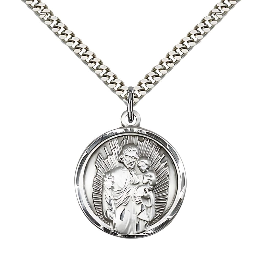 This St. Joseph Round Medal Necklace showcases a finely crafted medal available in sterling silver, gold-filled, or 14kt gold. Honoring St. Joseph, the esteemed patron saint of carpenters, dying and fathers. This Bliss Manufacturing piece is meticulously handmade in the USA. Delivered in an elegant gift box, the necklace comes with a lifetime guarantee, reflecting exceptional quality and craftsmanship.