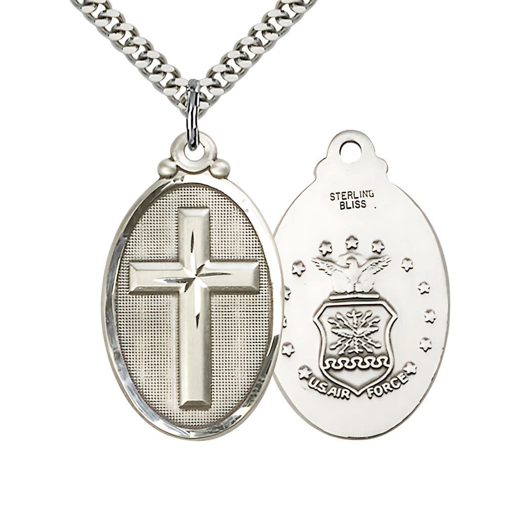 Embrace your faith with the Air Force Christian Cross Oval Medal Necklace features a sterling silver or gold-filled or 14kt gold medal. It comes with chain options with secured with a lobster claw clasp. The Air Force Christian Cross Medal presented in a deluxe gift box, this necklace is proudly handcrafted in the USA by Bliss Manufacturing and includes a lifetime guarantee.